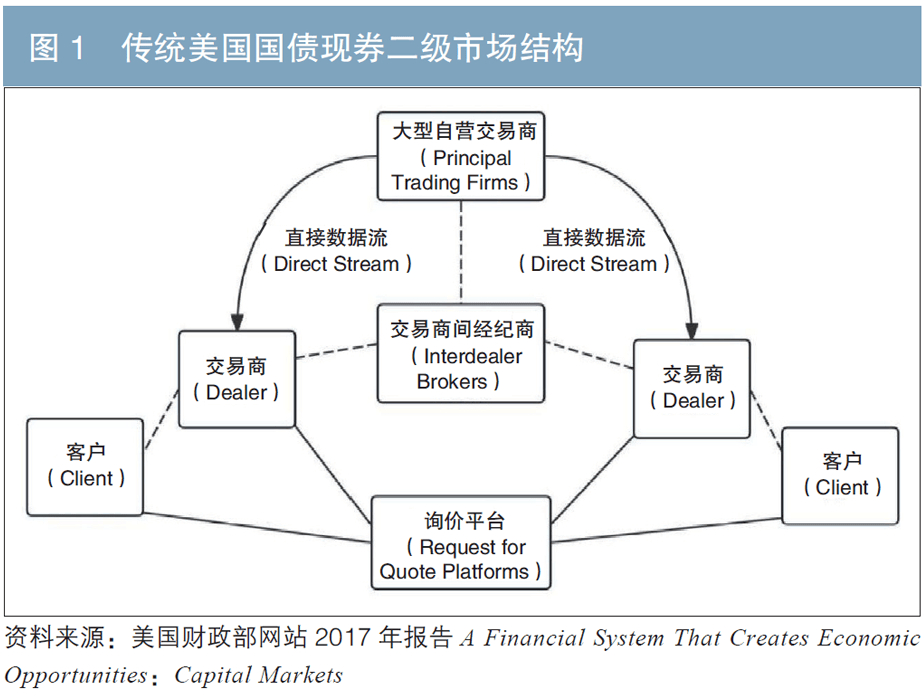 美国国债DTD市场是以交易商(Dealer)、大型自营交易商(PTF)及交易商间经纪商(IDB)等大型机构为主要参与者的市场。大部分共同基金、养老金等机构投资者并不在该市场交易。DTD市场大量依赖IDB为交易商提供撮合经纪服务。这些IDB管理中央限价订单簿(CLOB),使交易商能够匿名提交债券的买卖报价至订单簿,供其他交易商进行交易。目前,DTD市场中的绝大部分交易已经实现电子化。据统计,截至2020年3月,该市场中大约90%的交易通过电子交易平台(ETP)下单,交易平台包括BrokerTec(经纪科技)、NASDAQ Treasuries(eSpeed)(纳斯达克国债eSpeed)、Dealerweb(交易商网络)、MarketAxess(市场通)等。近年来,PTF凭借在信息处理方面具有优势的自动交易算法,迅速崛起并成为美国国债市场流动性的重要提供者。美国财政部报告显示,在IDB市场电子交易中,PTF占大部分,而传统交易商已经缩减至只占30%—40%。